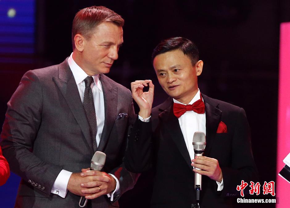Jack Ma (R), executive chairman of Alibaba Group, is with British artist Daniel Craig (L) on 2015 Tmall 11.11 Global Shopping Festival at the National Aquatics Center in Beijing on the night of Nov.10, 2015. (CNS/Han Haidan)