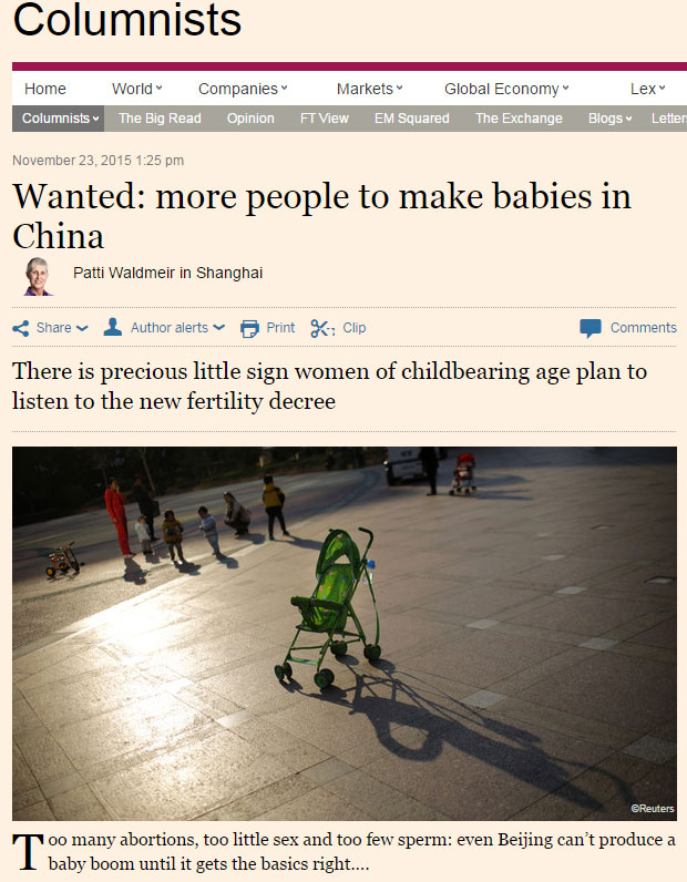 The English daily newspaper, Financial Times published an article entitled “Wanted: more people to make babies in China” on its website on November 23, saying that China is suffering a “sex shortage”, as its “white collar workers slave so long in the office that half said they had intercourse less than once a month”.