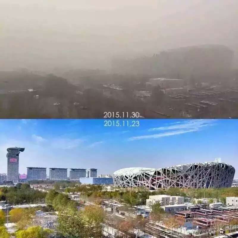 A shocking comparison of Beijing National Stadium under blue sky and in smog