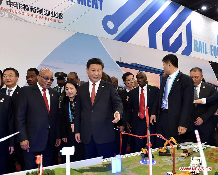 Chinese President Xi Jinping (3rd L, front) and South African president Jacob Zuma (2nd L, front) visit China-Africa equipment manufacturing industry exhibition in Johannesburg, South Africa, Dec. 4, 2015. Xi, Zuma and Zimbabwean President Robert Mugabe attended the opening ceremony of the exhibition on Friday. (Xinhua/Ma Zhancheng)