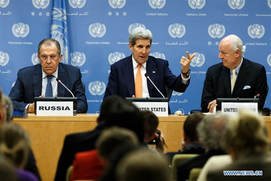 United States Secretary of State John Kerry (C), Russian Foreign Minister Sergei Lavrov (L) and United Nations special envoy for Syria Staffan de Mistura hold a press conference on Syria at the UN headquarters in New York Dec. 18, 2015. The UN Security Council on Friday adopted a resolution aimed at ending Syria's conflict through peace talks. (Xinhua/Li Muzi)