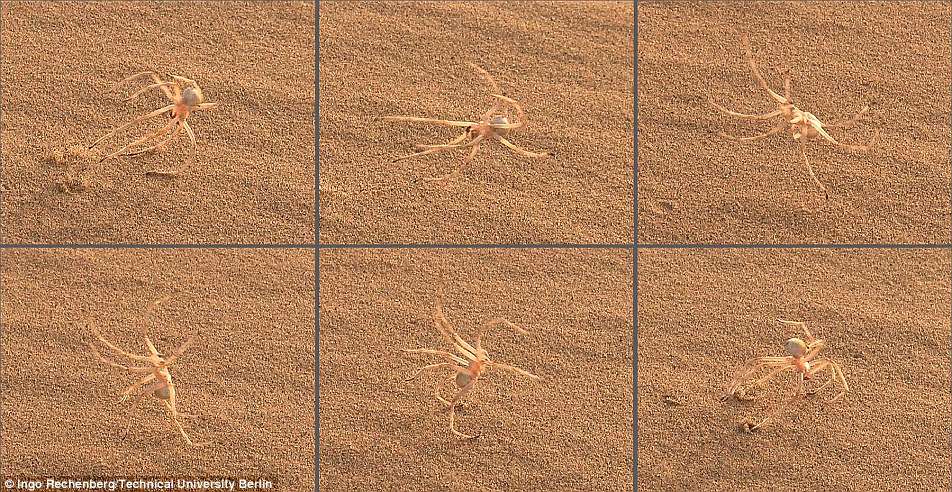 The Moroccan flic-flac spider hurls itself up and down hills in a cartwheel, as shown in the sequence of images above, as a last ditch resort to help it escape from predators. It can travel twice as fast when spinning than it can when running on its legs normally