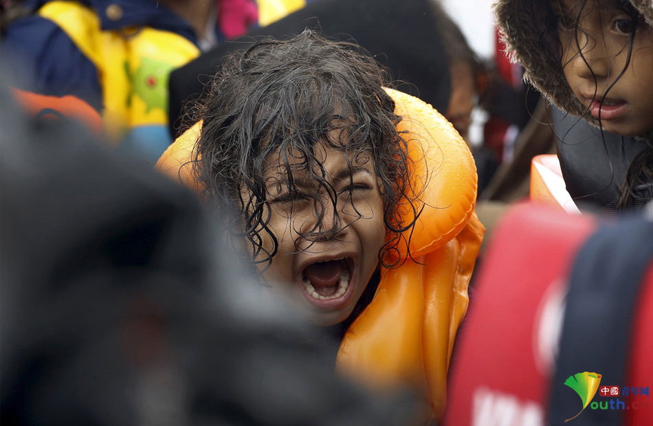 A Syrian refugee child cries in a crowded ship on the Greek island of Lesbos on Sept. 23, 2015.(Photo/Youth.cn)
