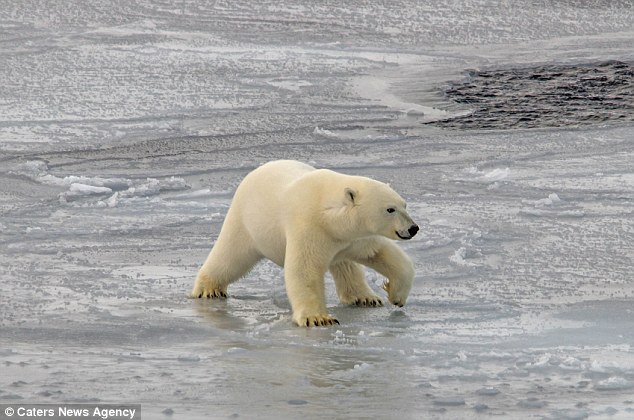 The polar bear takes a few tentative steps on the thin ice as he tries to assess if it will hold his weight