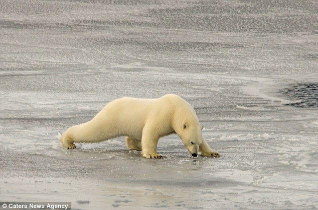 But only moments later, one of his back paws slides across the ice during the nervy food expedition