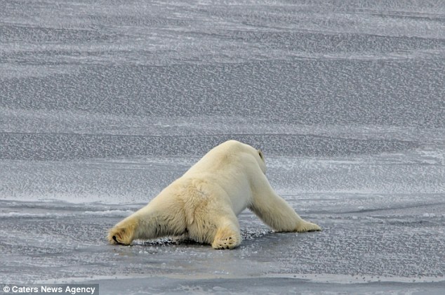 This is the hilarious moment a polar bear lies flat on the thin ice beneath him in desperate attempt to prevent it breaking under his weight.