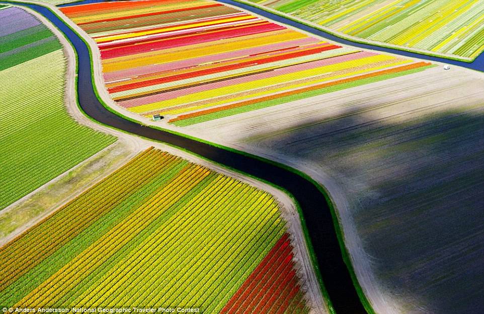 Vibrant patchwork: A bird's eye view of tulip fields near Voorhout was honoured in National Geographic's Photo Contest earlier this year