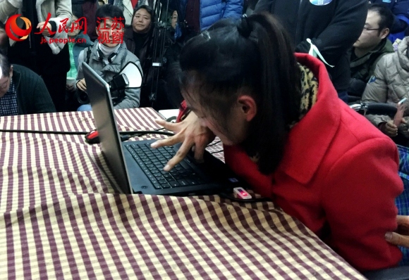 Wang Yi types with one finger at the book launch to express her gratitude. (Photo/people.cn)
