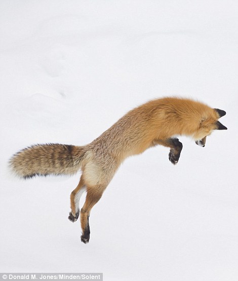 Skilled hunter: The bushy-tailed red fox listens to its prey before leaping three feet into the air and plunging headfirst into the snow