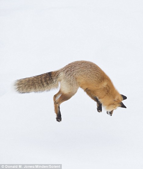 Wildlife photographer Donald Jones captured the red fox's entire hunt, from listening out for its prey and jumping into the air to plunging deep into the snow to secure its next meal.
