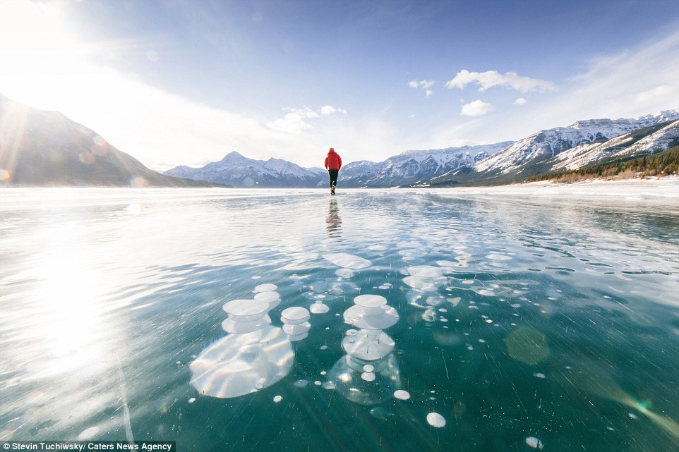The unique circles on the frozen surface of Abraham Lake are bubbles of flammable methane gas - a result of bacterias decomposing