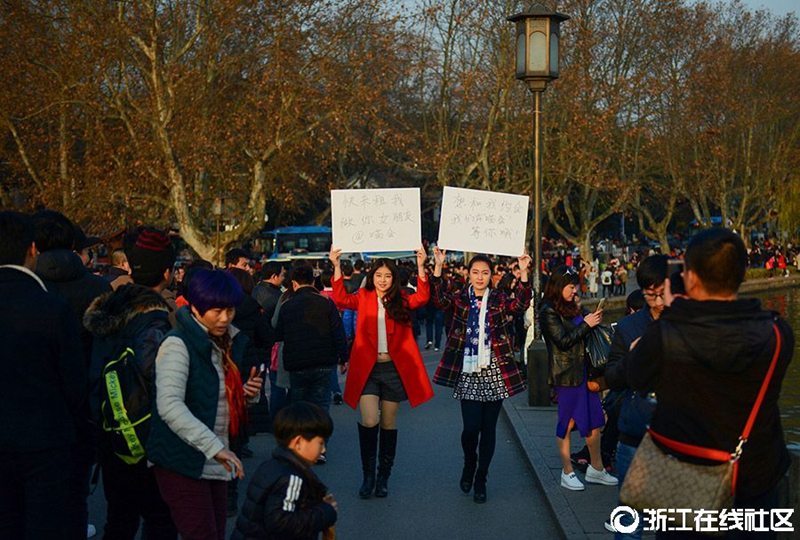 "Rent me as your girlfriend!" - Two beautiful women held a banner near the West Lake in Hangzhou, east China's Zhejiang province on Jan. 2, 2016. They said they are single college students and are willing to offer accompany services as a girlfriend in spare time. They were surrounded by the curious passers-by. Some said it was just a show. (Photo/Zjol)
