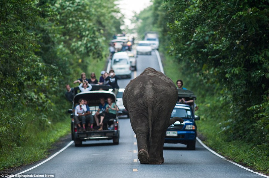 This elephant must have thought he was on a trunk road as he walked between cars - and created a long line of traffic.