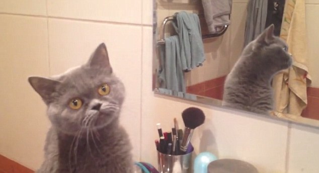 His good side: Unable to look away, Caesar jumps right back up to look at himself in the mirror from the other side of the sink
