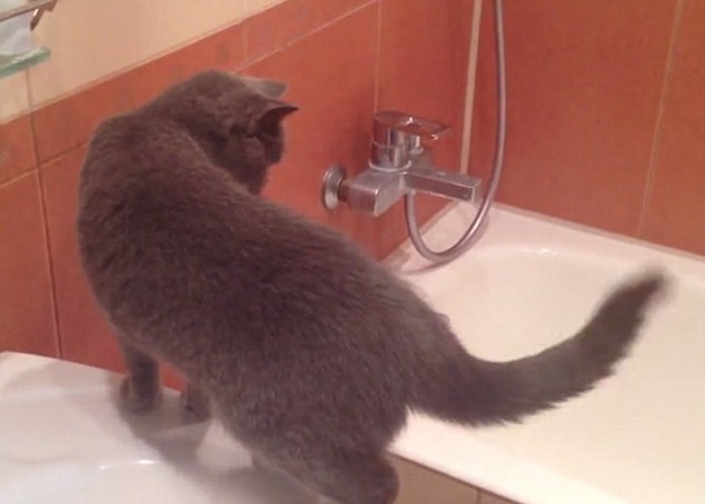 Blinded by beauty: Caesar decides to take a little break from looking at his magnificent face so as not to blind himself and hopes over to the bathtub - but only for a moment