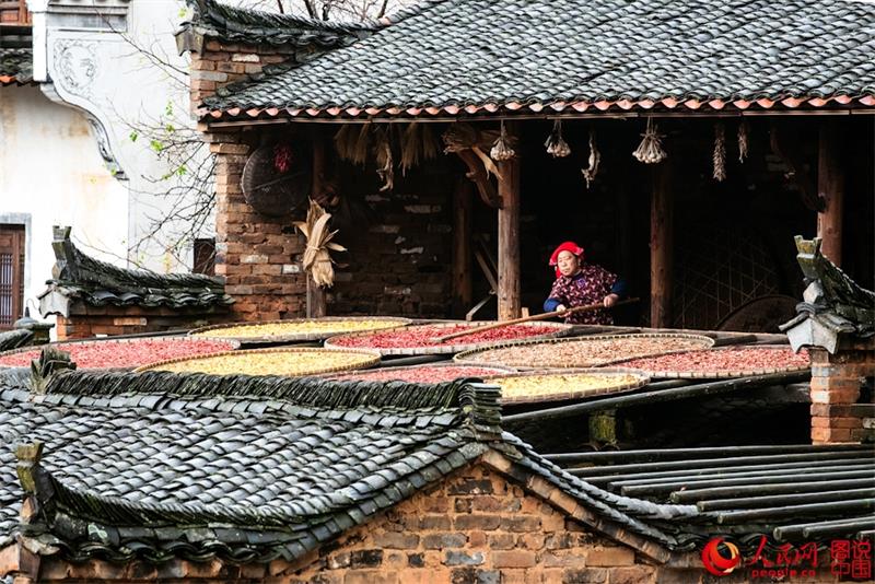 In autumn, the villagers in Huangling take out corn, chili peppers and chrysanthemum flowers to dry them in the sun. This tradition is called "shaiqiu" in Chinese.(Photo/people.cn)