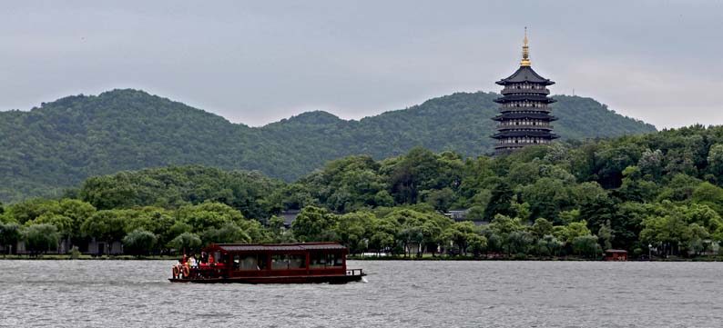Leifeng Pagoda, built during Five Dynasties and Ten Kingdoms period, is a five-story tower with eight sides, located on Sunset Hill south of the West Lake in Hangzhou, China. The pagoda was an octagonal structure built of brick and wood and with a base built out of bricks.