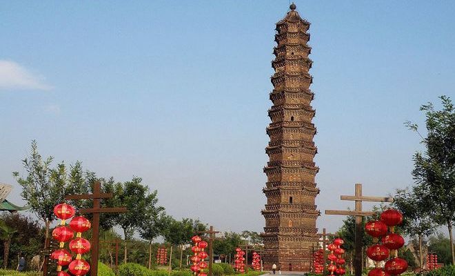 The Iron Pagoda of Youguo Temple, Kaifeng City, central China's Henan province, is a Buddhist Chinese pagoda built in 1049 during the Song dynasty (960–1279) of China. The pagoda is so-named not because it is made of iron, but because its color resembles that of iron. It is a brick pagoda tower built on the location of a previous wooden one that had been burnt down by lightning fire in 1044.
