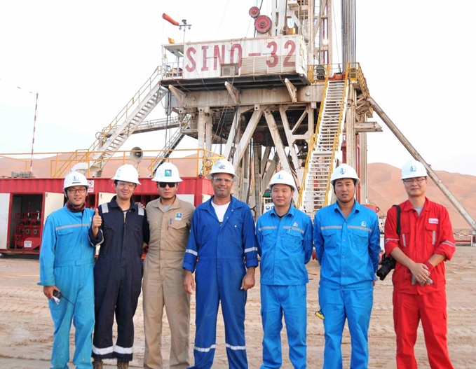 Staff of China's Sinopec and Saudi Aramco pose for a photo at a drilling platform in Eastern Saudi Arabia.