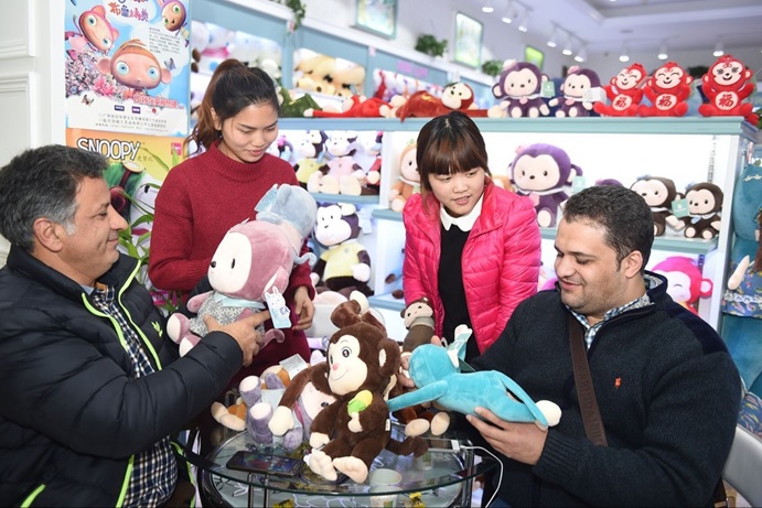 An Iranian customer purchases a stuffed monkey in East China's Zhejiang Province on December 31, 2015.