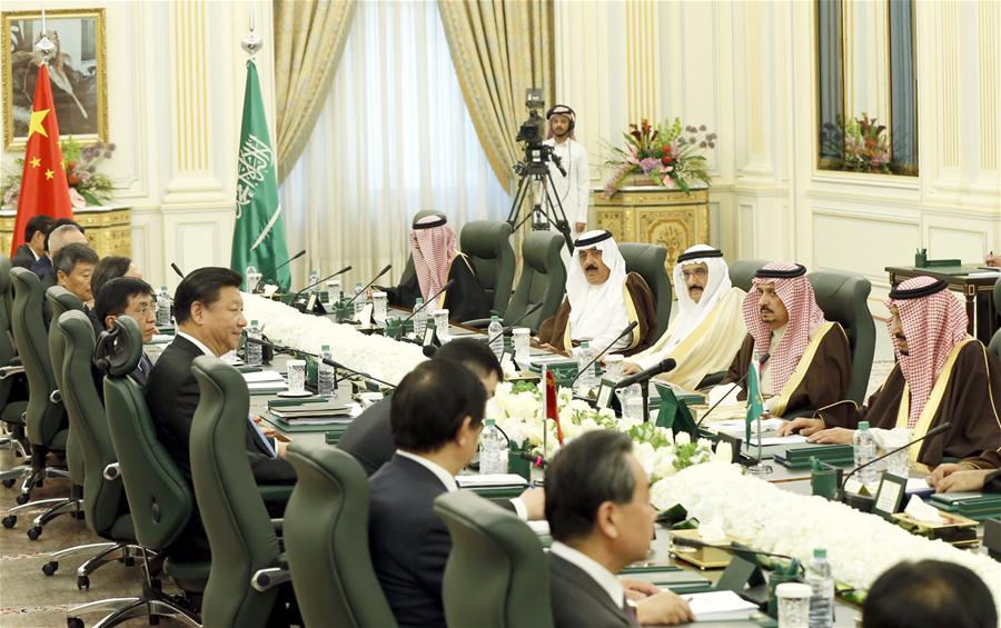 RIYADH, Jan. 19, 2016-- Chinese President Xi Jinping holds talks with Saudi King Salman bin Abdulaziz Al Saud in Riyadh, Saudi Arabia, Jan. 19, 2016. Xi arrived here on Tuesday for a state visit to Saudi Arabia, the first stop of his three-nation tour of the Middle East. (Xinhua/Ju Peng)