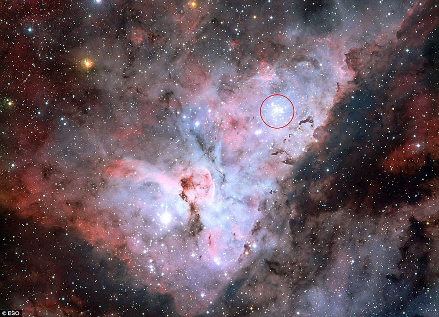 This colour-composite image of the Carina Nebula reveals exquisite details in the stars and dust of the region. The open star cluster Trumpler 14, a collection of very bright, young stars within the Carina Nebula, is marked with a red circle. To the bottom left of the image is one of the most impressive binary stars in the Universe, Eta Carinae, with the famous Keyhole Nebula just adjacent to the star.