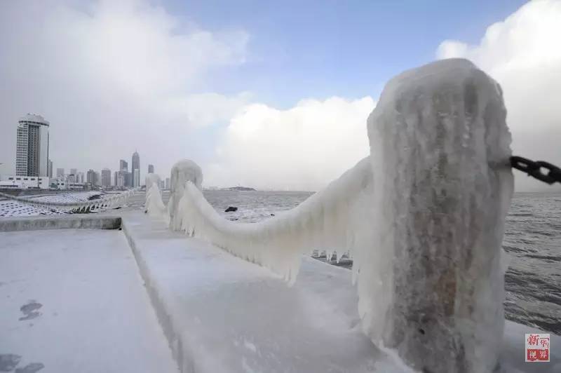 Photo taken on Jan. 19, 2016 shows fence covered with icicles at a wharf in Yantai, east China's Shandong province. (Xinhua/Chu Yang)