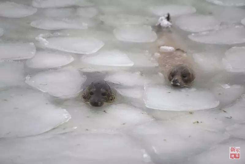 Two spotted seal swim in icy water in a resort area in Yantai, east China's Shandong province on Jan. 20, 2016. (Xinhua/Chu Yang)