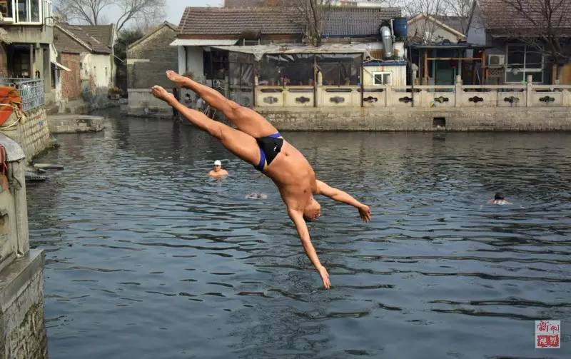 A winter swimming fan jumps into water at Zhuoying Spring, in Jinan, east China's Shandong province on Jan. 20, 2016. (Xinhua/ Xu Suhui)