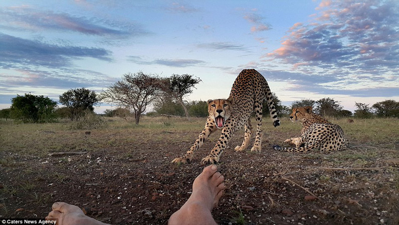 This is the terrifying moment a wild cheetah approached a daring photographer in an African game reserve - before starting to lick his toes.