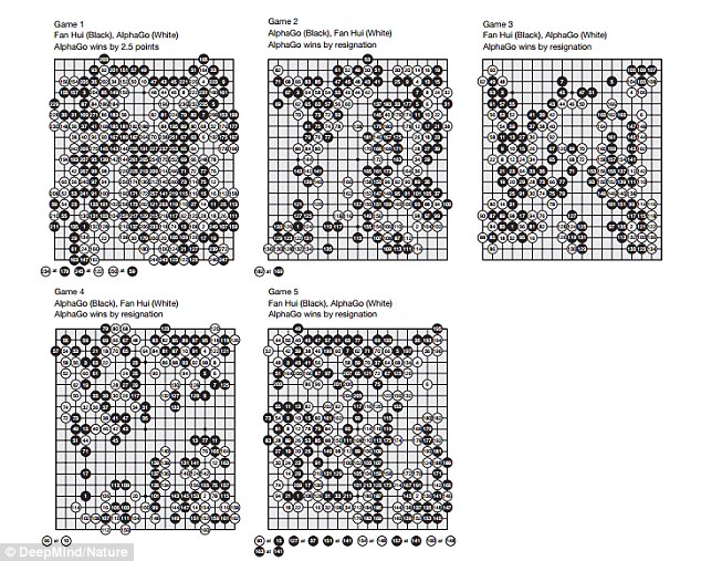 The program took on reigning three-time European Go champion Fan Hui at Google's London office. In a closed-doors match last October, AlphaGo won by five games to zero (the end positions are shown)