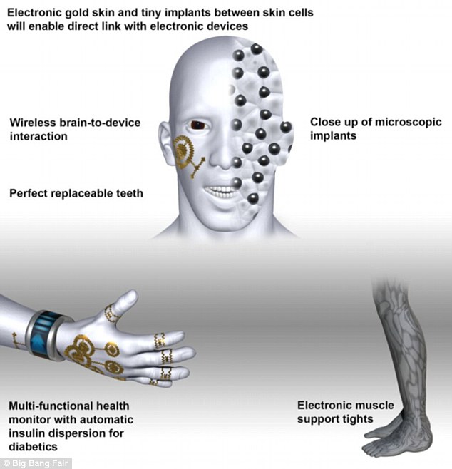 Futurologist Dr Ian Pearson claims that in the next 35 years, humans will be able to communicate with computers to evolve better senses, memory and even intelligence. Electronic gold skin and tiny implants between cells could enable a direct link with devices, while we could 'wear' muscle too (illustrated above)