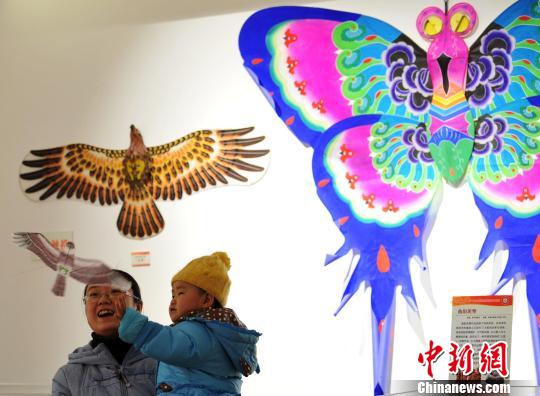 A mother happily plays the kite with her child in the exhibition. (CNS/Zhai Yujia)