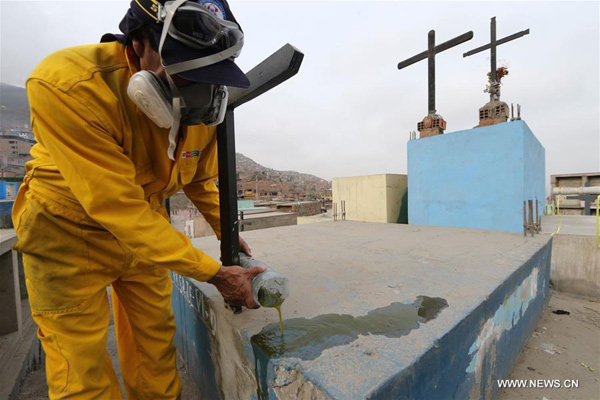 A brigadier of the Ministry of Health does a fumigation in a cementary in Lima, Peru, on Feb. 1, 2016. The recent cluster of microcephaly cases and other neurologic disorders reported in Brazil constituted a Public Health Emergency of International Concern, the World Health Organization (WHO) said Monday. (Xinhua/Norman Cordova/ANDINA)