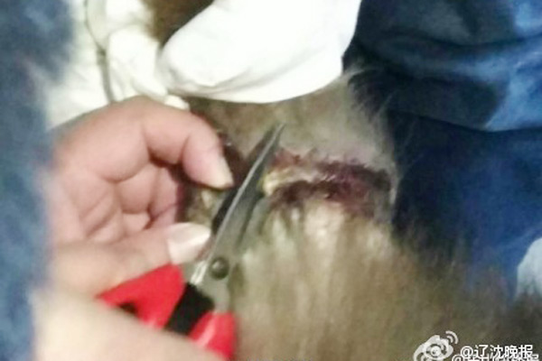 A vet cuts nylon cord which had caused a wound on the right leg of the monkey king. [Photo/Weibo.com]