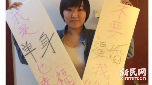 The undated photo shows a woman with banners saying 'being single can also be happy.' [File Photo: xinmin.cn]