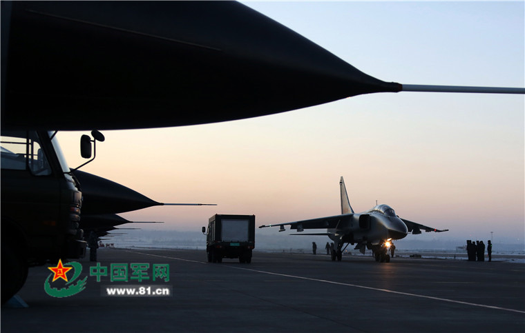 A JH-7 fighter bomber prepares to take off again at dusk for round-the-clock flight training. A PLA Air Force aviation brigade stationed in northwest China’s Xinjiang Uygur Autonomous Region recently conducted round-the-clock flight training in a frigid environment of 21 degrees below zero at the north foot of Tianshan Mountain.