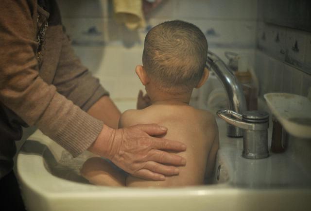 Yu's mother-in-law bathes her granddaughter on Feb.10, 2016, the third day of Chinese Lunar New Year. (Photo/Yu Yang)