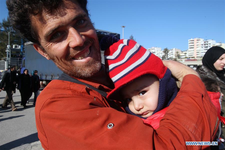 Refugees and migrants aboard the passenger ferry Blue Star Patmos arrive at the port of Piraeus, near Athens, Greece, Feb. 1, 2016. Almost 6,000 refugees who registered at the islands of Lesbos and Chios arrive at the Port of Piraeus. Hundreds keep making the crossing from Turkey to the Greek islands despite bad weather conditions. (Xinhua/Marios Lolos)