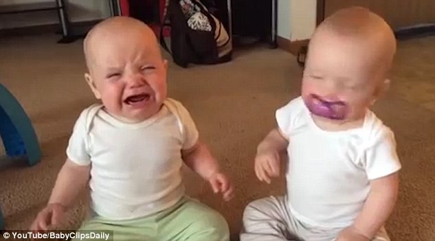 But it's the one in green who seems to win the feud, after she takes back the pacifier and then realises she can turn her head away from her sister's grasp