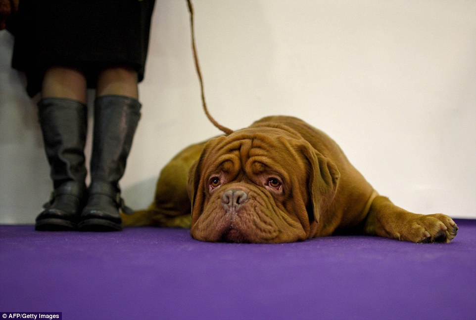 A Dogue de Bordeaux, a breed of French mastiff weighing up to 140 pounds, waits lazily in the competition area