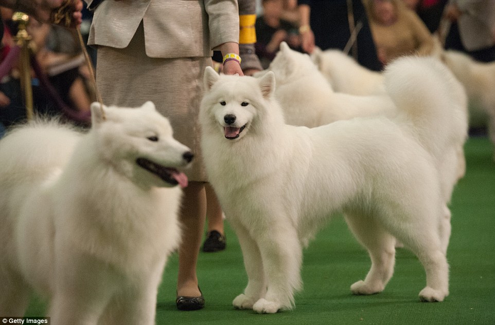 A group of Samoyed dogs, which takes its name from the Samoyedic peoples of Siberia, prepare to compete in the ring