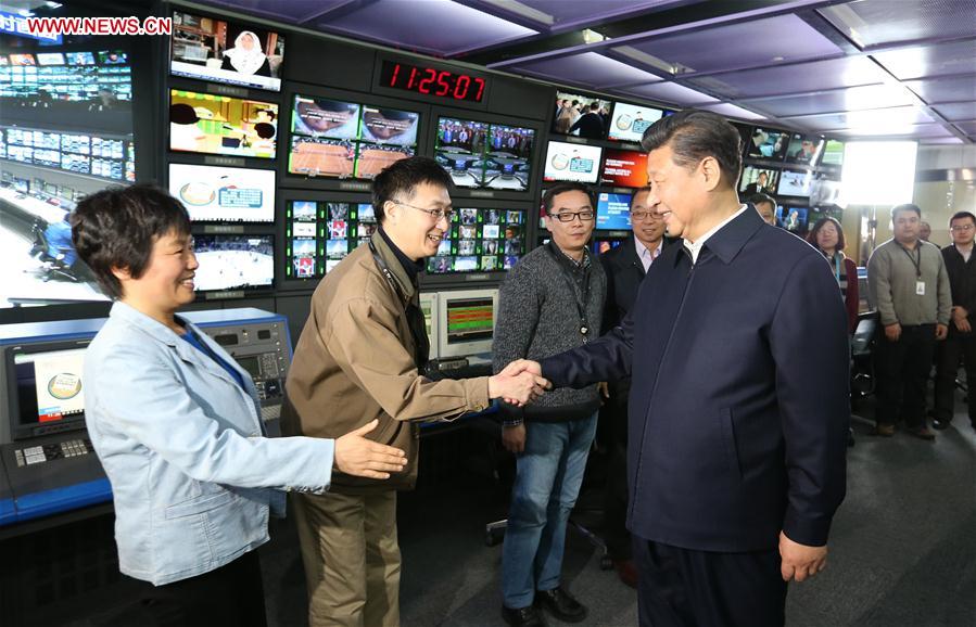 BEIJING, Feb. 19, 2016 -- Chinese President Xi Jinping (R, front) shakes hands with staff members at the control room of China Central Television (CCTV) in Beijing, capital of China, on Feb. 19, 2016. Xi on Friday visited the People's Daily, Xinhua News Agency and CCTV, the nation's three leading news providers. (Xinhua/Ma Zhancheng)