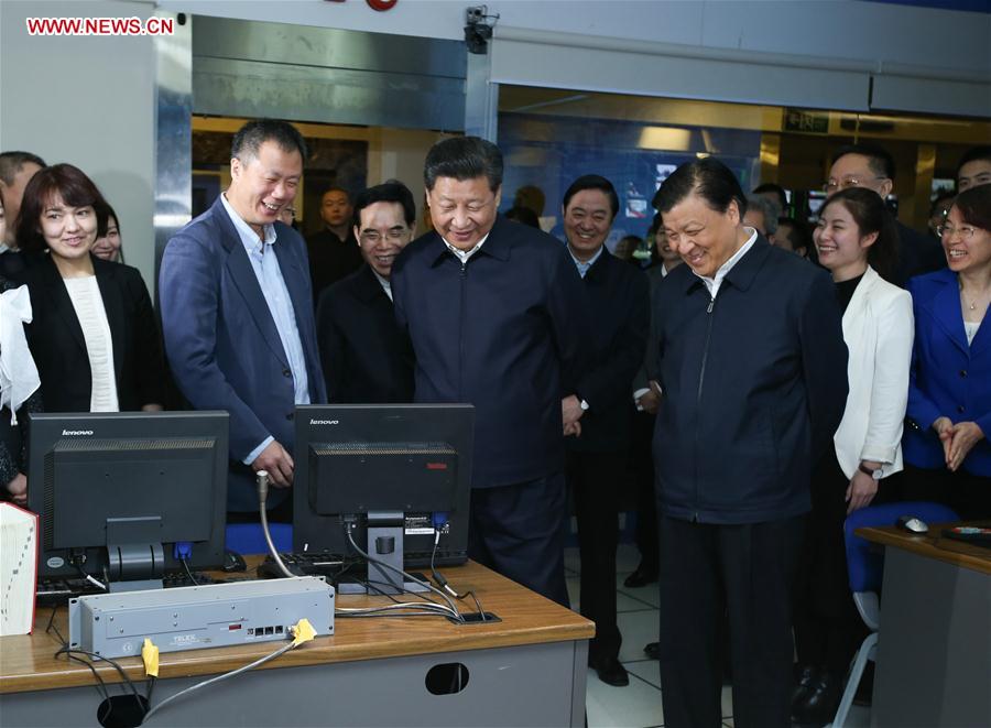 BEIJING, Feb. 19, 2016 -- Chinese President Xi Jinping (C) is shown the studio where China Central Television (CCTV) Evening News Bulletin, or "Xinwen Lianbo," is filmed at the headquarters of CCTV in Beijing, capital of China, on Feb. 19, 2016. Xi on Friday visited the People's Daily, Xinhua News Agency and CCTV, the nation's three leading news providers. (Xinhua/Yao Dawei)
