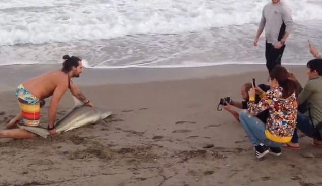 The man pins the struggling creature down for at least a minute while posing for the cameras, before eventually returning the shark to the water