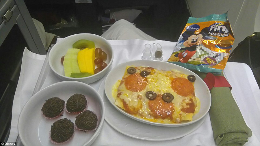 Full Disney theming: Images show food on the plane being presented in the shape of Mickey mouse.