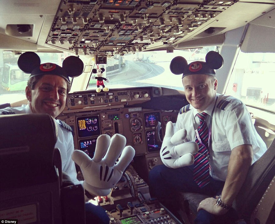 Pilots caught Disney fever too with hats, gloves and even a plush toy of Mickey dangling from the cockpit ceiling.