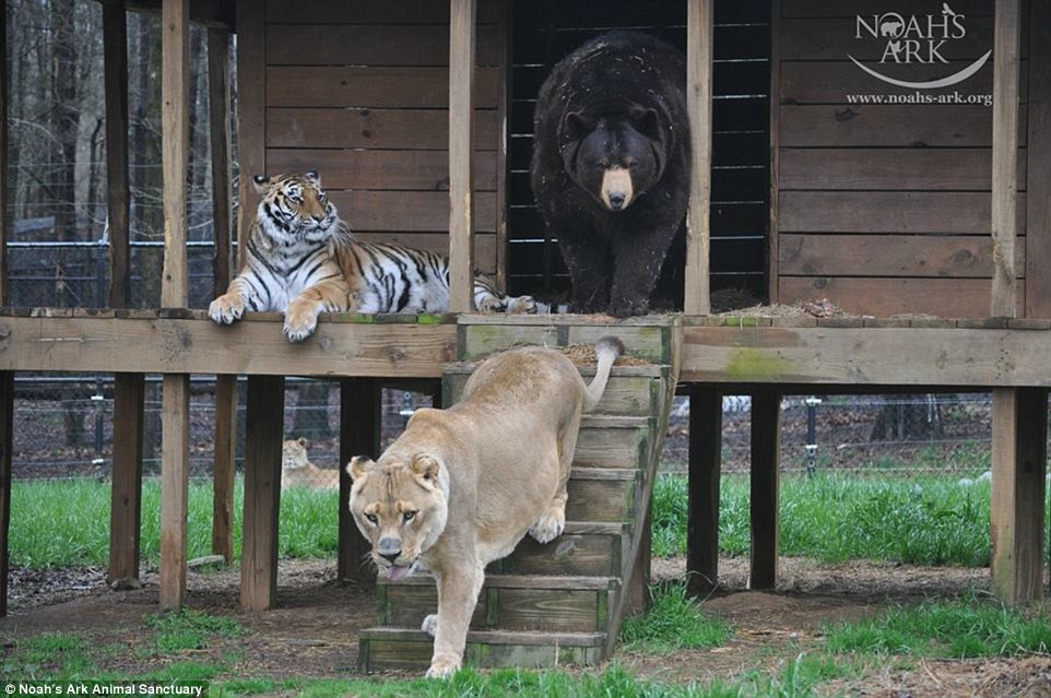 Baloo the American black bear, Leo the African lion, and Shere Khan the Bengal tiger were rescued by police in the basement of an Atlanta home during a drug raid back in 2001. They were all less than one year old and wounded severely. The police later sent them to the Noah's Ark Animal Shelter in Georgia.