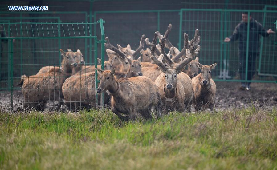 Mooses run out of hurdles at the East Dongting Lake National Nature Reserve, central China's Hunan Province, March 3, 2016. 16 mooses from the Dafeng Moose National Nature Reserve of Jiangsu Province were released to the East Dongting Lake National Nature Reserve of Hunan Province on Thursday. (Xinhua/Li Ga)