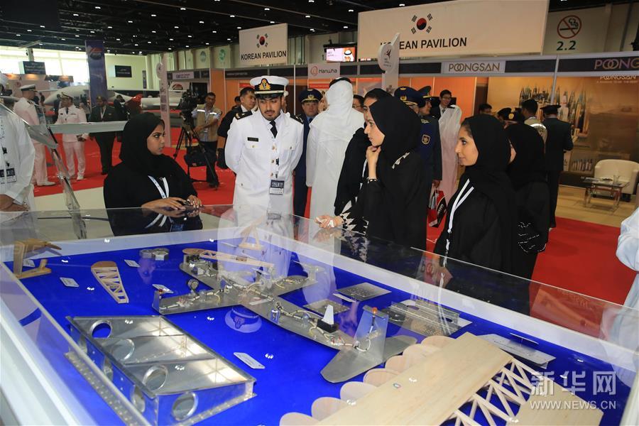 A staff member (L1) from Higher Colleges of Technology in the United Arab Emirates introduces structure of unmanned aerial vehicle on March 6, 2016 at the second Unmanned Systems Exhibition & Conference in Abu Dhabi, United Arab Emirates. (Xinhua/An Jiang)